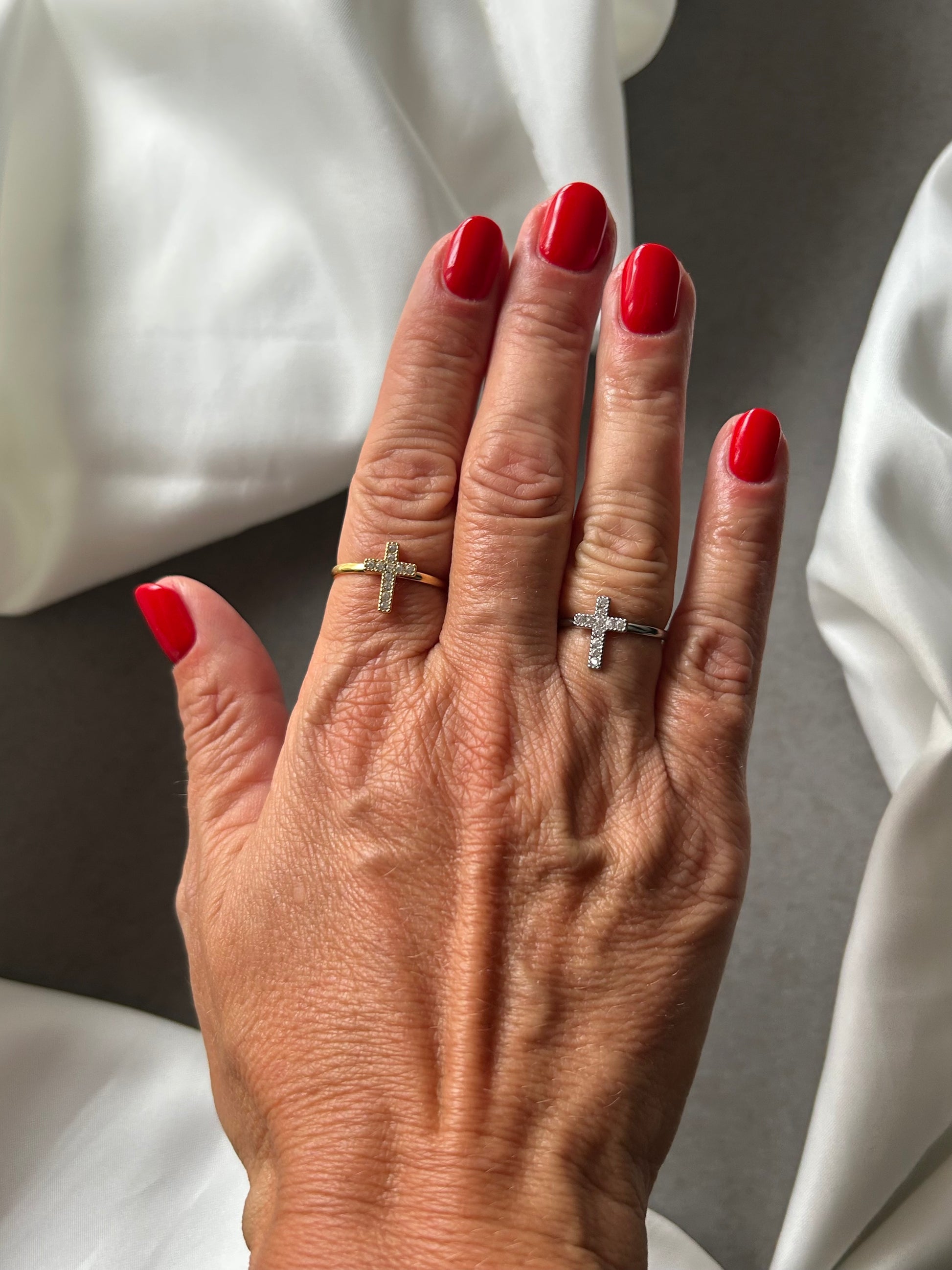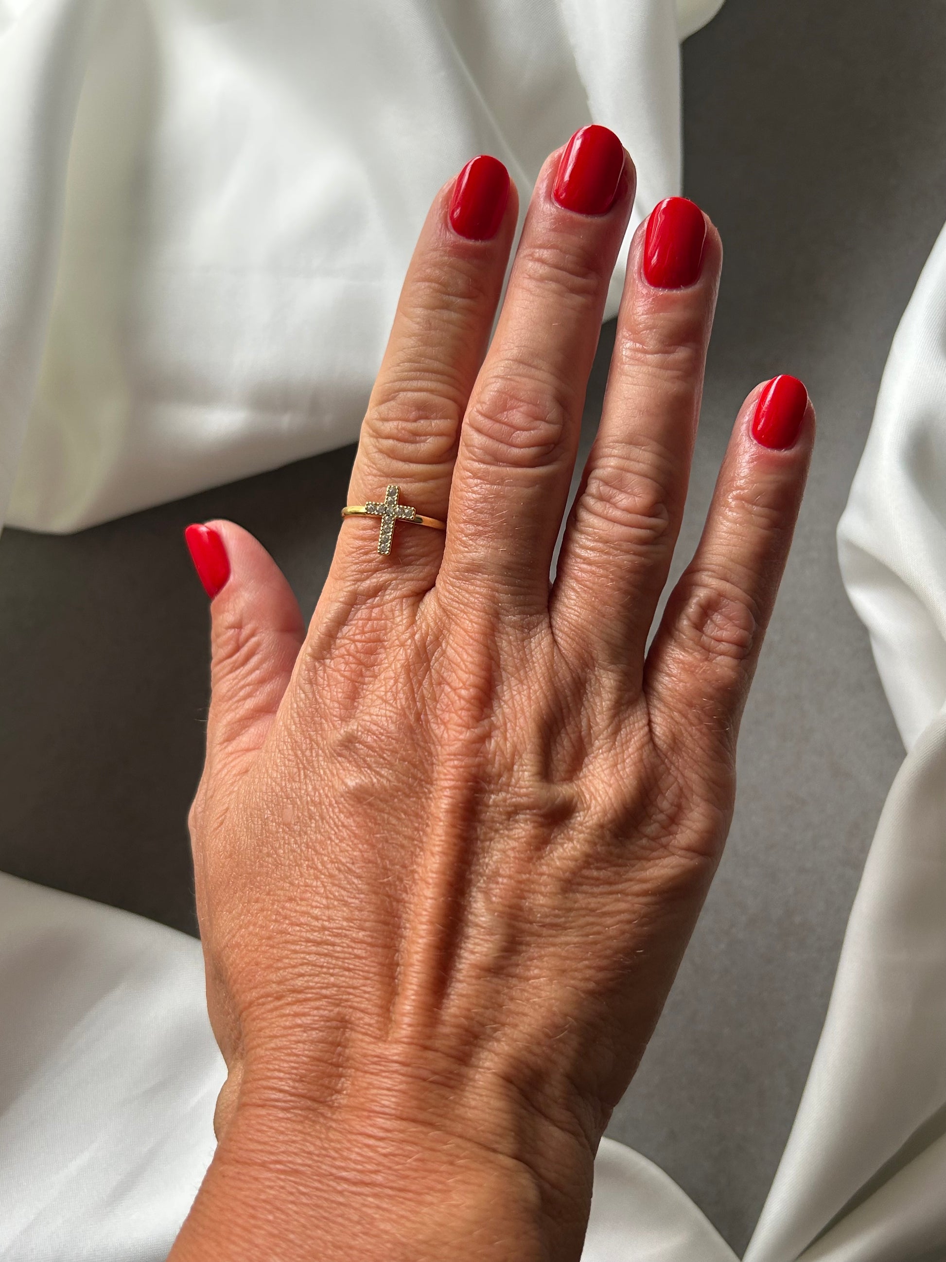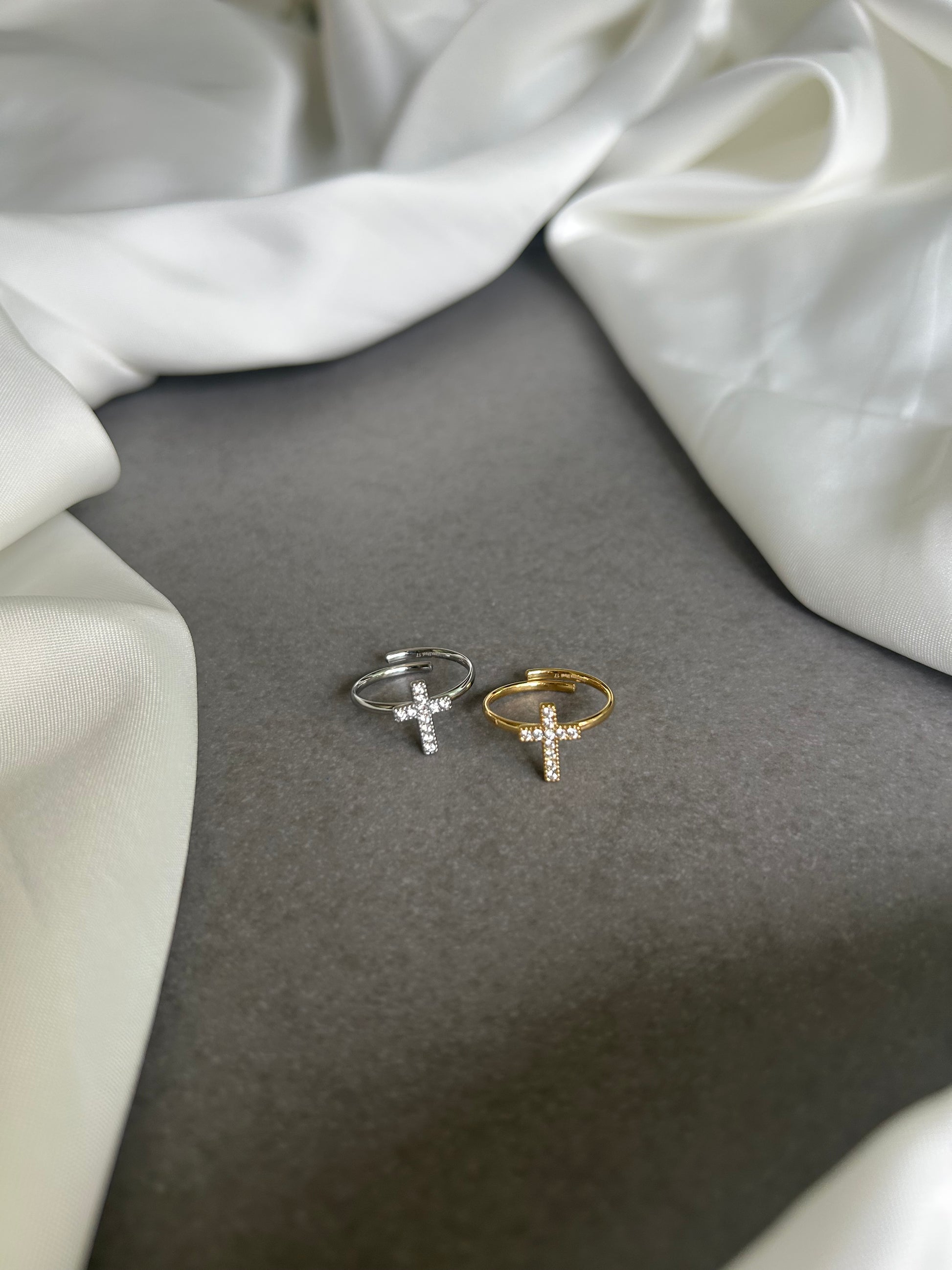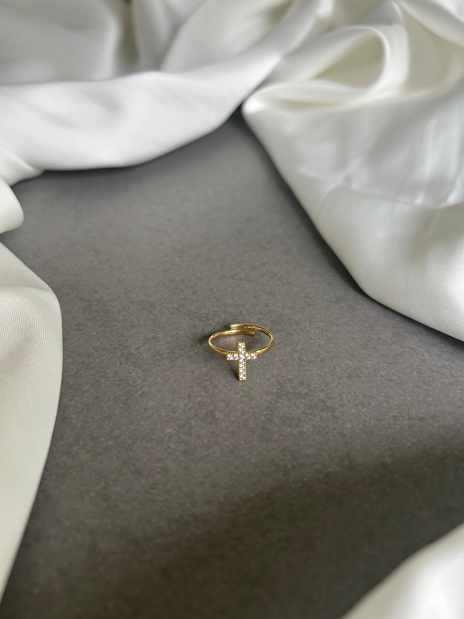 This gold sacred cross ring is embellished with sparkling rhinestones, highlighting its devout and refined design. A perfect piece for those who want to carry an elegant and luminous symbol of faith, ideal for both everyday wear and special occasions.