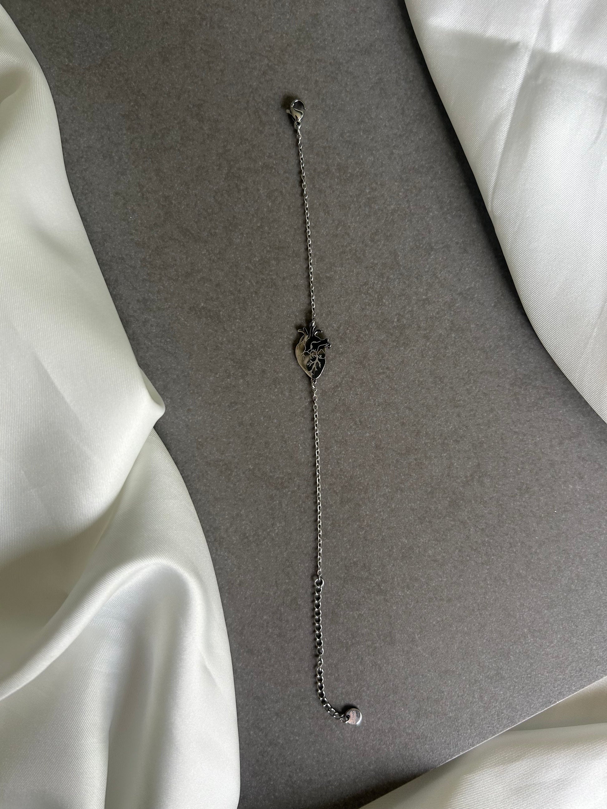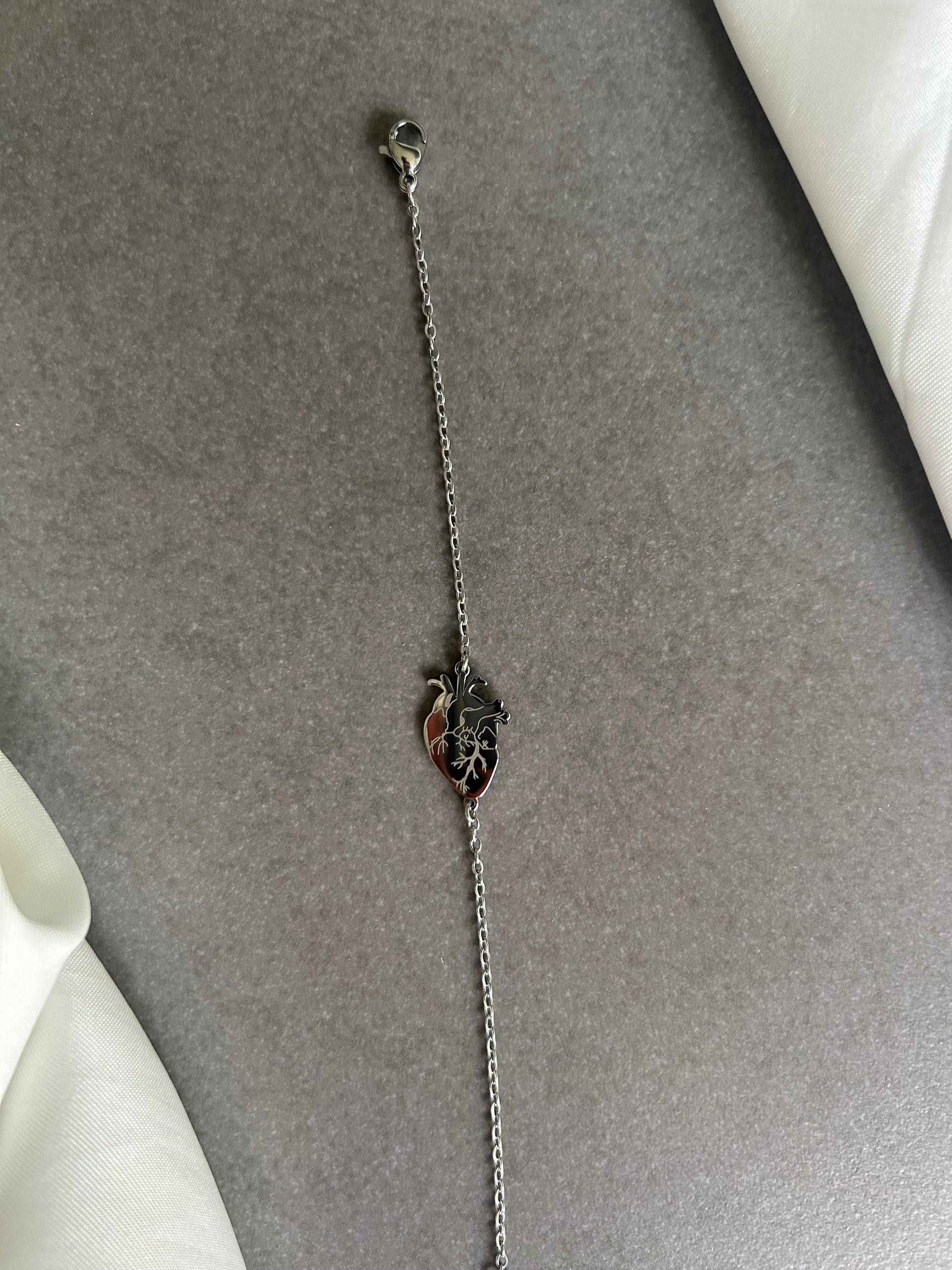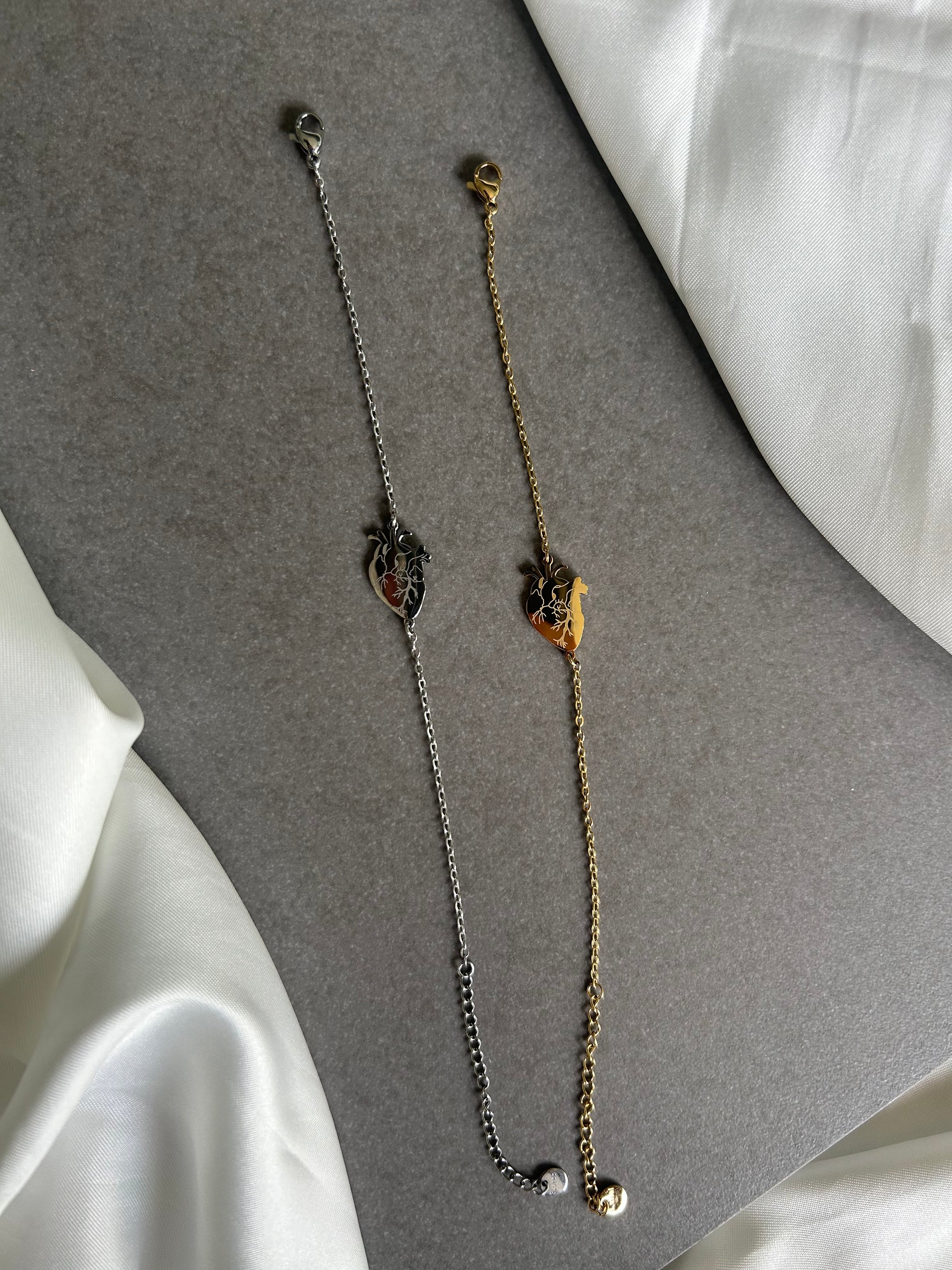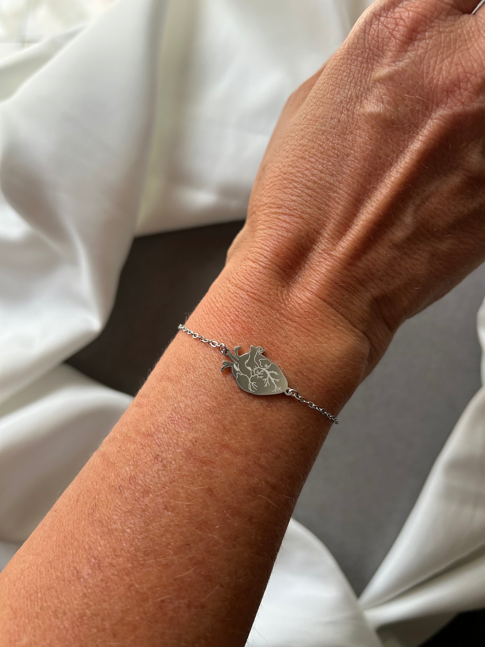 This bracelet celebrates the heart in all its truth: not only a symbol of life, but of pure and unconditional love for faith. The delicately engraved anatomical heart represents the sincerity of those who believe without masks, of those who entrust their heartbeats, their joys, and their wounds to God.