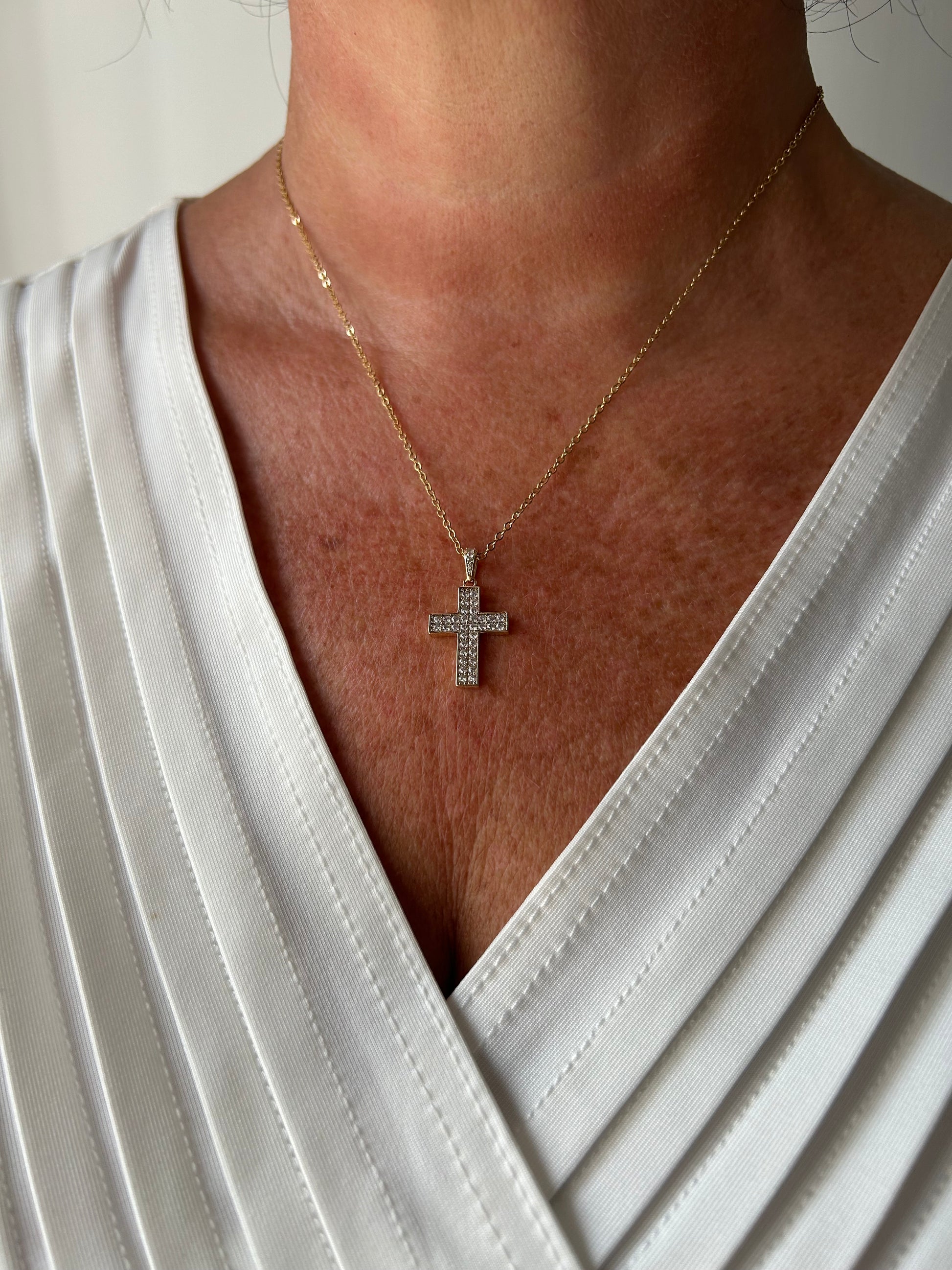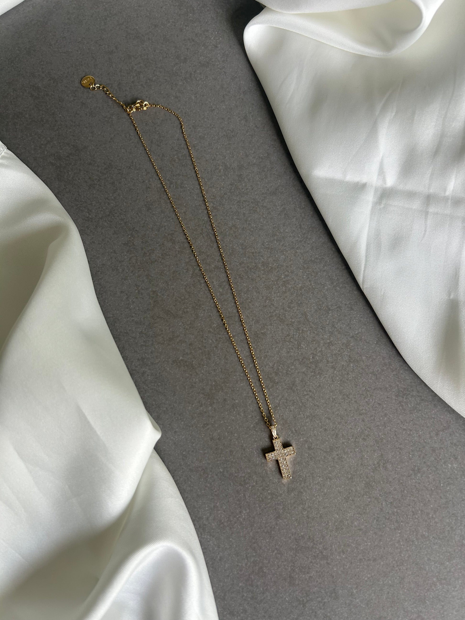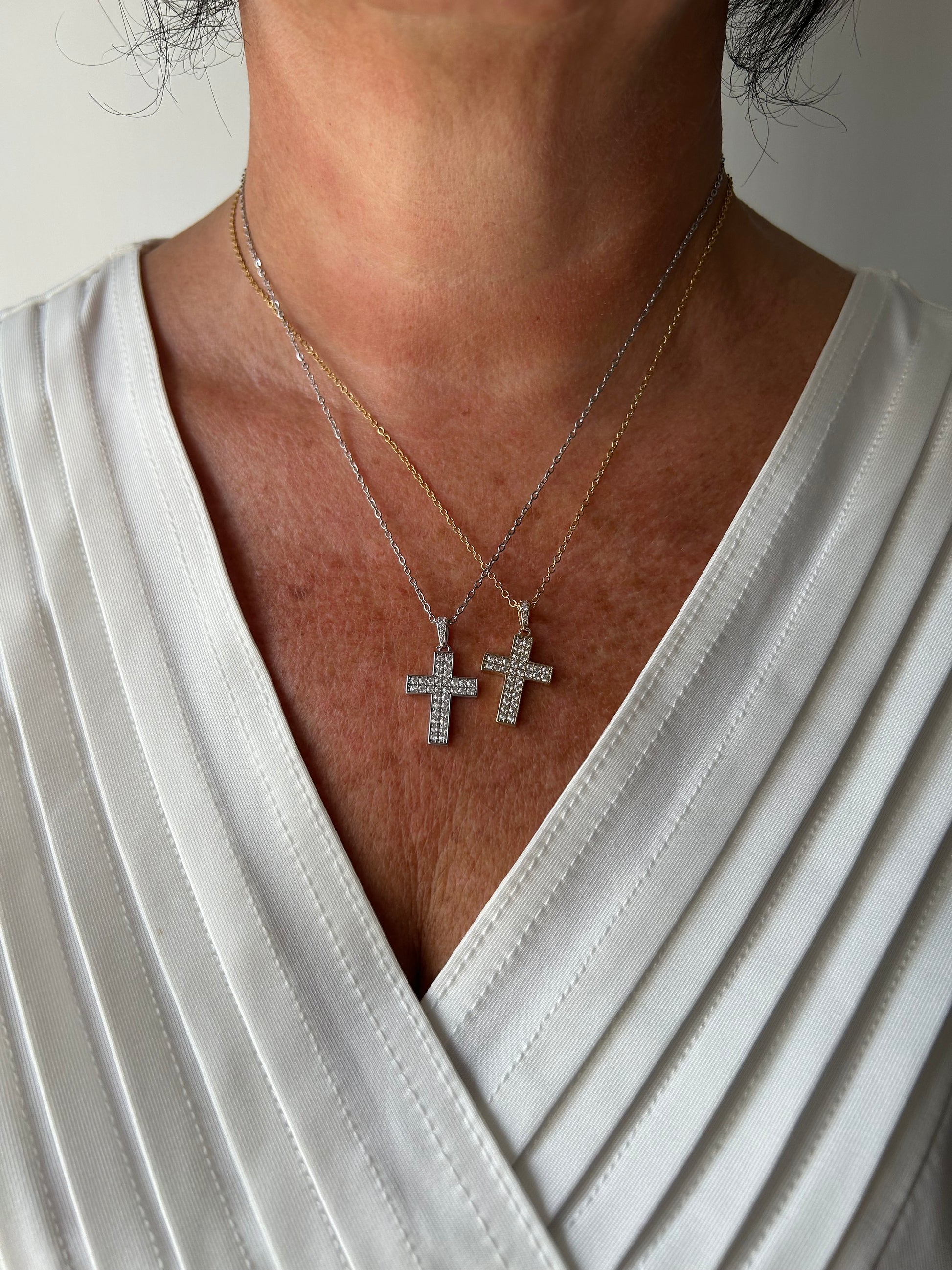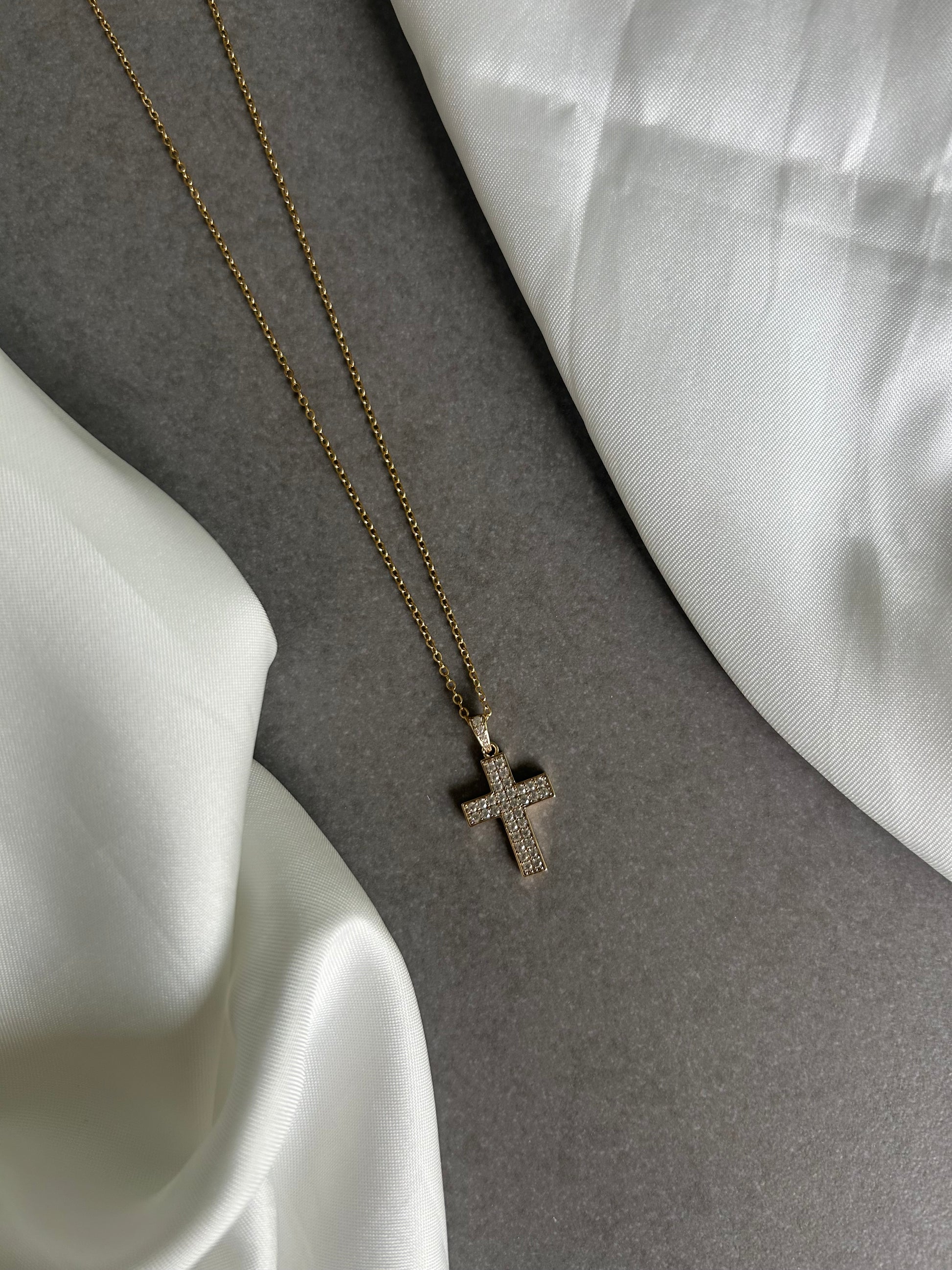 A timeless cross, illuminated by zirconia that reflects the light like sparks of hope. This necklace is not just a piece of jewelry, but a symbol to be worn: the faith that accompanies you, the protection that sustains you, the light that illuminates your days.