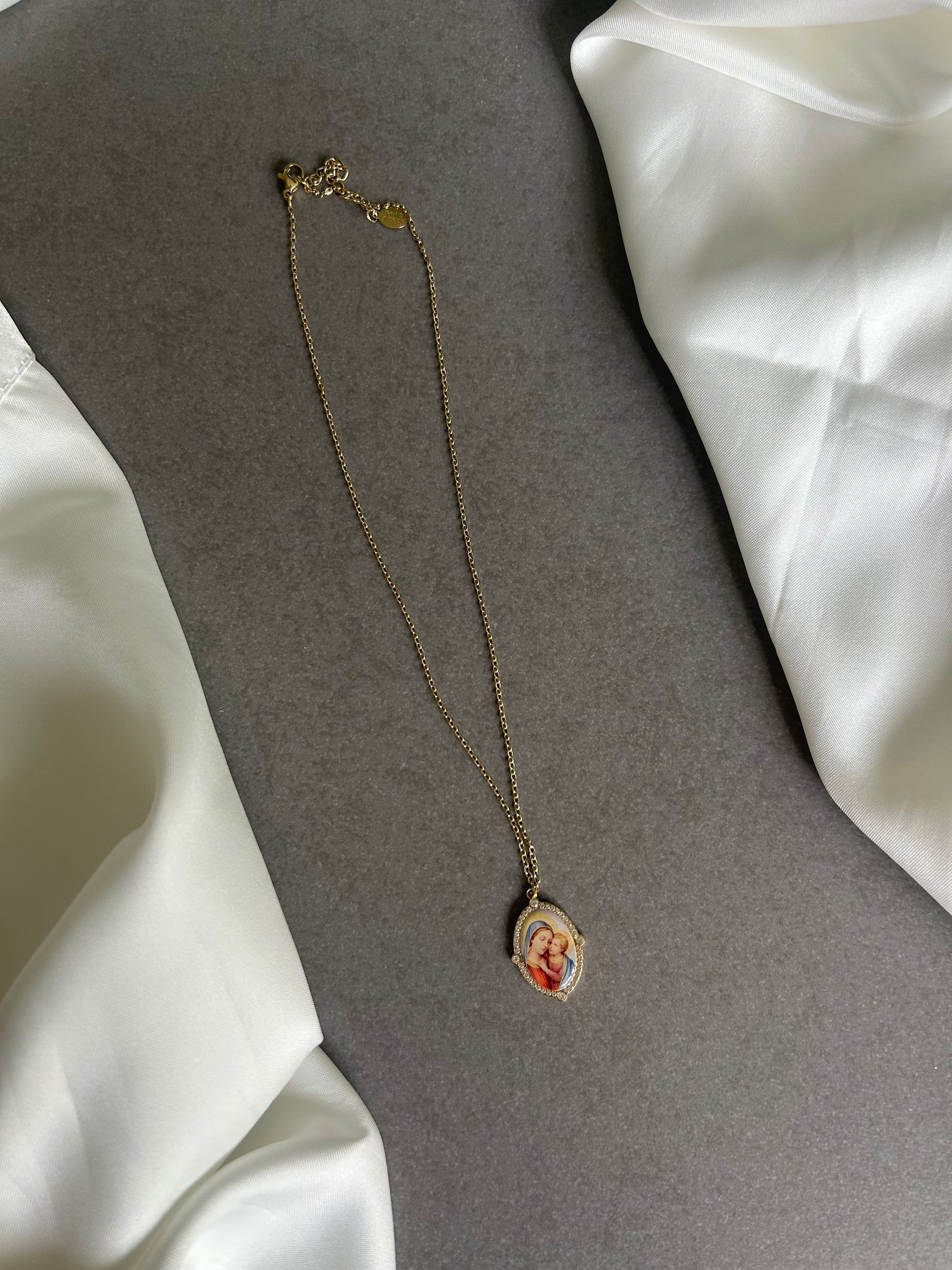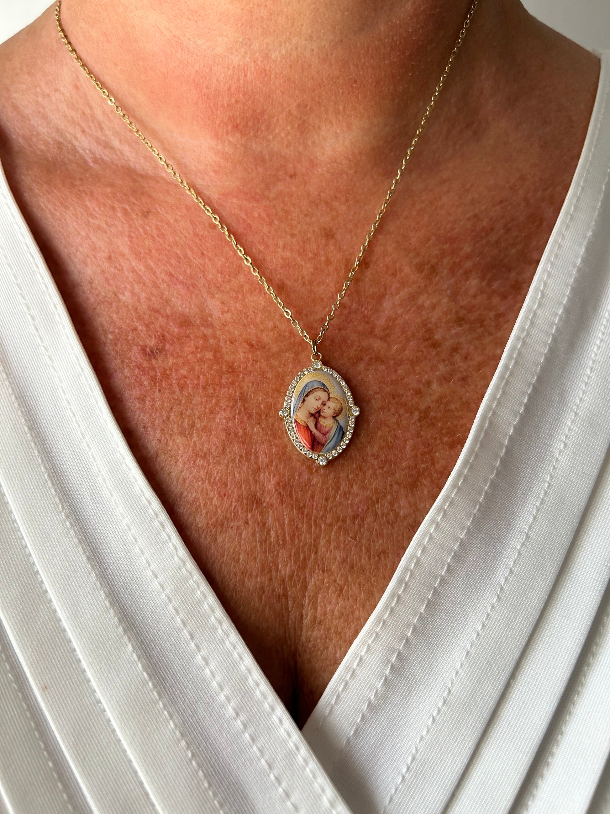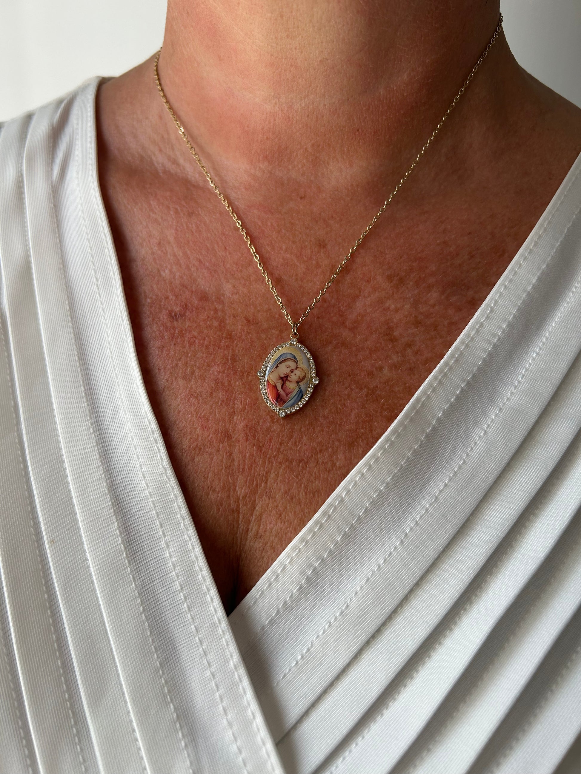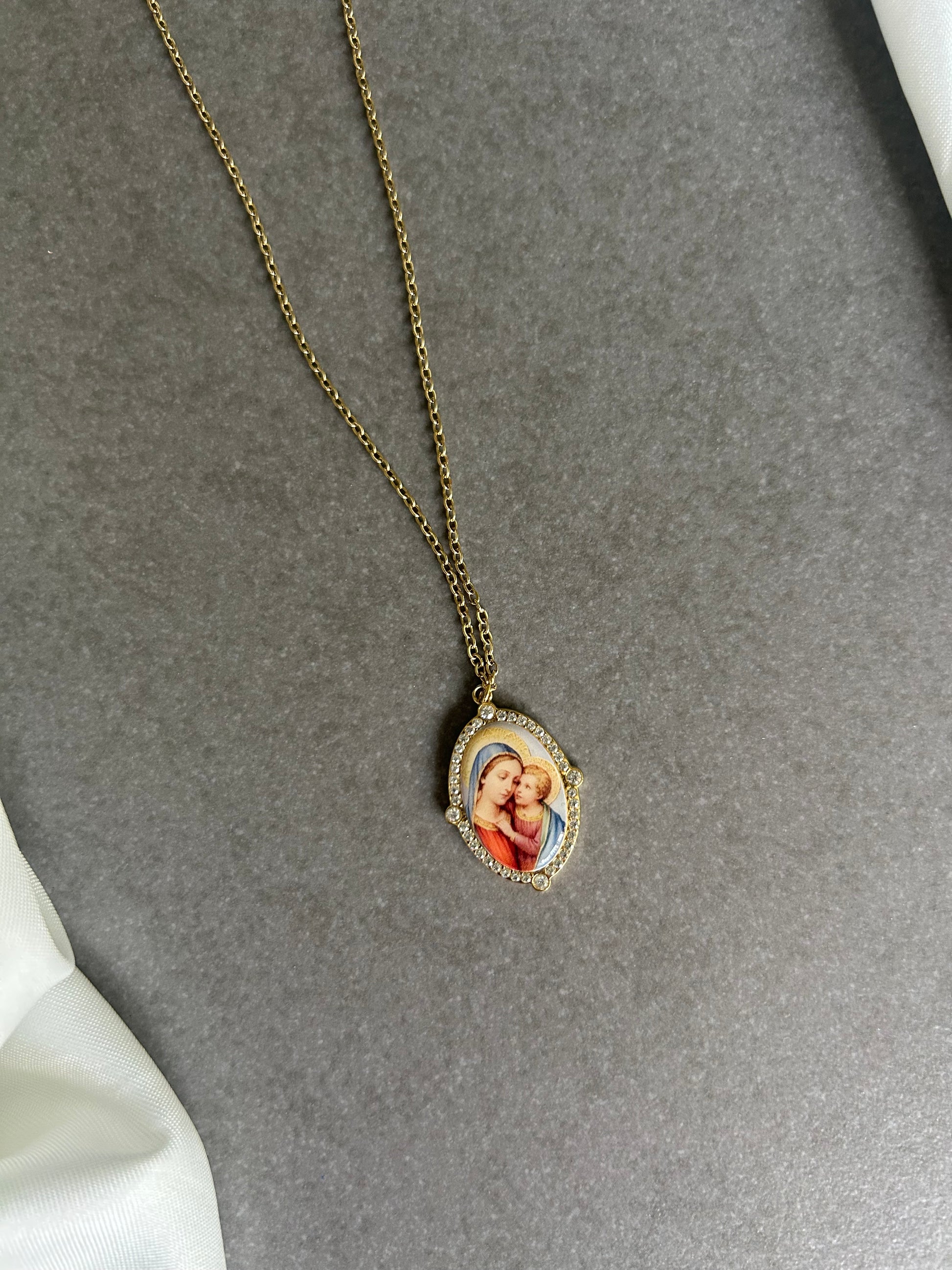 A pendant that tells of the infinite tenderness between Mother and Son: Mary guarding Jesus, a symbol of the purest love and the eternal bond between heaven and earth.